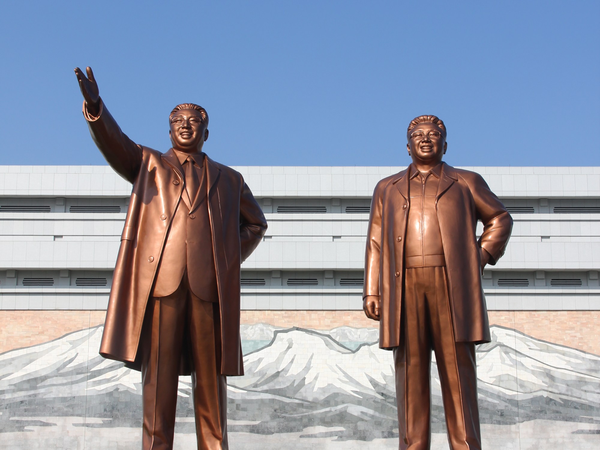 Vierailumme varsinainen ohjelma alkoi eilen kaikkein tärkeimmällä, vierailulla Mansudae-monumentilla. Paikka on pohjoiskorealaisista uutiskuvista tuttu jättiläismäisen kokoinen Suuren Johtajan pronssipatsas. Nyttemmin viereen on pönäytetty myös talvella kuolleen Rakkaan Johtajan Kim Jong-Ilin vähintäänkin yhtä mahtipontinen kuva. Tämä on paikka, jossa alamaiset käyvät säännöllisesti ja tiheään tuomassa massiivisia kukkia ja kumartamassa. Koska meidän odotetaan noudattavan paikallisia tapoja, kuului ”syvä kunnioitus” myös meidän tehtäviimme. Tämä on tähän mennessä ollut myös ainoa paikka, jossa valokuvaaminen ei ole ollut luvanvaraista vaan itse asiassa pakollista. Ryhmäämme oli jossain vaiheessa liittynyt mukaan myös videokuvaaja, joka itsestäänselvästi kuvasi myös kumarruksemme matkamuisto-DVD:tä varten. Kenellekään ei liene epäselvää, mihin muuhun tarkoitukseen tätä ulkomaalaisjoukon Suurelle Johtajalle esittämää tervehdystä käytetään.